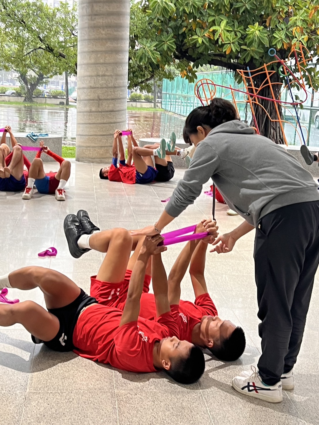 本次「下肢肌力訓練實作課程」由Influencer影響者張雁如防護員主講,針對足球選手常見的踢球動作及膝關節傷害預防去進行設計訓練內容,幫助學生強化相關肌群、髖部啟動、串聯身體的協調性與動作控制。課程運用鋼片與環狀彈力帶進行訓練,並加入來回衝刺、交叉步、側併步與快速繞8字等動作,提升學員的下肢力量、敏捷度與協調性。講師強調,穩定的核心是有效發揮四肢動作的基礎,對提升運動表現與成績有直接幫助。課程中也細心指導學生如何正確執行每一項訓練動作,讓學生不僅了解肌群的功能,也能在未來運動中更有效應用所學。